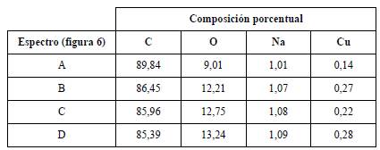 Los resultados obtenidos por EDS (tabla 3) indican la presencia de cuatro elementos (C, O, Cu y Na). El carbono se encuentra en mayor proporción y proviene de la estructura de los NTCPM, mientras que la señal del sodio posiblemente se debe a trazas del material catalítico utilizado en la elaboración de los NTCPM. El cobre observado proviene de la malla portamuestras, y el oxígeno de la oxidación del cobre.