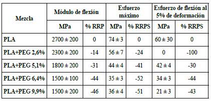 Respeto al uso del plastificante PEG, se observó una disminución en los módulos de flexión y tensión, así como en el esfuerzo máximo al aumentar el porcentaje de PEG en el PLA, convirtiéndolo en un material fácil de procesar, útil para el ahorro energético industrial y con mayor deformación plástica para aplicaciones donde el PLA necesita mayor flexibilidad.
