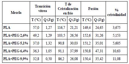 Se observa una disminución en la temperatura de cristalización en frío al aumentar la concentración de PEG. Esto sugiere que, al aumentar la movilidad de las cadenas ubicadas en zonas amorfas, se aumenta también la velocidad de cristalización, esto le permite al polímero cristalizar más fácilmente. No se observan señales relacionadas con la temperatura de cristalización (Tc) durante el enfriamiento del PLA y de las mezclas de este con PEG, por lo tanto, el PLA y sus mezclas con PEG no cristalizan durante el enfriamiento [64, 66]. Al disminuir la temperatura de cristalización, la cantidad de zonas cristalinas debería incrementarse, lo cual se puede apreciar en la tabla 5. También se observa que la cristalinidad tiende a aumentar, de esta forma, el PEG sirve como agente de nucleación para las estructuras cristalinas al dar más libertad de movimiento a las cadenas [64, 67].