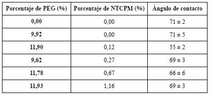 En la tabla 7 se muestra el ángulo de contacto de una gota de agua colocada sobre cada material. Se observa un ángulo de contacto similar en todos los casos. El de PLA presenta un valor 71 ± 2° relacionado con su carácter hidrofóbico. La adición de PEG 9,9% reporta un valor de 71 ± 5°, similar al reportado para el PLA, por lo tanto, el carácter hidrófobo se mantiene y la adición de PEG no representa una alteración superficial significativa. Con la adición de NTCPM se obtiene en todos los casos valores similares de ángulo de contacto. Las energías de humectabilidad no se ven modificadas y no varía significativamente el carácter hidrofóbico del PLA con la presencia del nanomaterial [73].