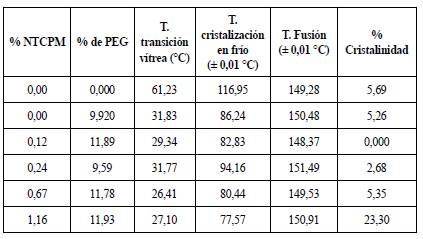 La temperatura de cristalización posee la tendencia de reducirse y es claro que, conforme aumenta la concentración de NTCPM, la temperatura de cristalización se reduce a excepción de la mezcla PLA-PEG-NTCPM 0,24 %, en la cual es posible que la reducción no se haya generado porque se adicionó una menor cantidad de PEG, siendo este el que produce una reducción considerable de la temperatura de cristalización (30,77 °C). Al aumentar la cantidad de nanotubos de carbono en la mezcla se genera una mayor cantidad de sitios de nucleación y, por esto, es que la temperatura de cristalización se reduce, al generar cristales a menores temperaturas [75].