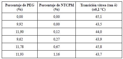 En la figura 13 y en la tabla 9, se presentan los resultados de temperatura de tan δ que nos permiten obtener el valor de la transición vítrea de las mezclas analizadas. Se observa que hay una disminución en los valores de Tg, debido al efecto plastificante causado por el PEG.