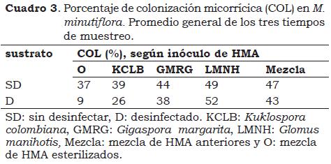 El porcentaje de COL presentó diferencias significativas para la condición del sustrato y altamente significativas para inóculo, época de muestreo y las interacciones sustrato - inóculo y sustrato inóculo tiempo (Cuadro 1). La condición del sustrato SD estimuló la colonización micorrícica para todos los inóculos evaluados. Sin embargo, LMNH expresó el más alto potencial de micorrización en las dos condiciones del sustrato. El proceso de desinfección aplicado al suelo redujo casi en su totalidad la actividad de los HMA nativos (D + o) (Cuadro 3).