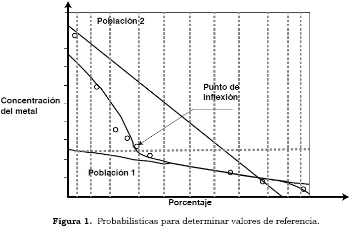 Las relaciones probabilísticas permiten distinguir valores discordantes de metales pesados en suelos, para la separación de las poblaciones normales o no contaminadas de las contaminadas; sin embargo, esta metodología requiere tamaños de muestra grandes. El procedimiento consiste en representar gráficamente la concentración del elemento en función del porcentaje de frecuencias acumuladas mediante la aplicación de un programa estadístico (Fleischhauer y Korte, 1990; Tobías et al., 1997). Para la determinación de los valores de referencia mediante el uso de gráficas probabilísticas se representa en una escala aritmética o logarítmica la concentración de metal del suelo en función de la distribución de la población analizada versus la frecuencia acumulada de los valores. El punto de inflexión que aparece en la representación gráfica permite distinguir la población de fondo (población 1) de posibles datos de zonas con contaminación específica (población 2) por metales pesados - Figura 1 (Peris, 2006).