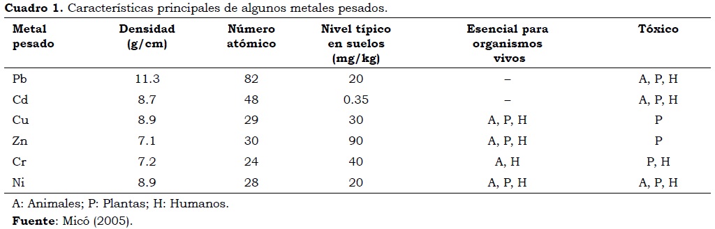 Los metales pesados son elementos con densidad superior a 5 g/cm-3. Generalmente se encuentran en pequeñas cantidades y pasan a ser tóxicos a partir de un determinado umbral de concentración. Entre ellos se encuentran más de 20 elementos que tienen relación con los seres vivos por ser esenciales para que los organismos completen su ciclo vital (Díez, 2006; Camilotti et al., 2007). Estos metales se clasifican en dos grupos: el primero considera los micronutrientes esenciales para los organismos vivos (plantas, animales y humanos), como Co, Cr, Cu, Fe, Mn, Ni y Zn, pero pueden producir efectos tóxicos cuando sobrepasan determinados niveles, y el segundo lo componen aquellos que no presentan una función biológica conocida y que después de determinados niveles provocan disfunciones graves en los organismos, incluidos los seres humanos, como es el caso de Cd, Pb, As y Hg (Moolenaar et al., 1997; García y Dorronsoro, 2005; Granero y Domingo, 2002; Peris, 2006; Recatalá et al., 2010). En el Cuadro 1 se presentan las características principales de algunos metales pesados de interés agrícola y ambiental.