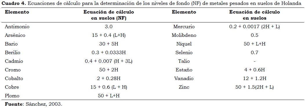 Los resultados de la fase de análisis de laboratorio son el insumo para la determinación de los niveles de fondo de metales pesados en suelos, y para su derivación se utilizan diferentes métodos estadísticos, como la media, la desviación estándar, el mínimo y el máximo. En algunas investigaciones se ha utilizado la media aritmética para determinar las concentraciones de metales pesados con distribución normal, la media geométrica para distribución log-normal y la mediana si la distribución es no normal. Otros autores utilizan los percentiles para el análisis de resultados en la distribución no normal (Esser, 1996; Díez, 2006; Peris, 2006). De igual manera, para declarar un suelo no contaminado por metales pesados se han utilizado ecuaciones de regresión para establecer la correlación entre determinadas propiedades de los suelos, como el porcentaje de arcilla y contenido de materia orgánica y las máximas concentraciones de metales (Díez, 2006). En Holanda la determinación de los niveles de fondo se realizó teniendo en cuenta la naturaleza del suelo y el análisis se expresó en función del porcentaje de arcilla (H) y materia orgánica (L). En el Cuadro 4 se incluyen las ecuaciones utilizadas para la determinación de los niveles de fondo (mg kg-1) de acuerdo con el criterio holandés (Sánchez, 2003).