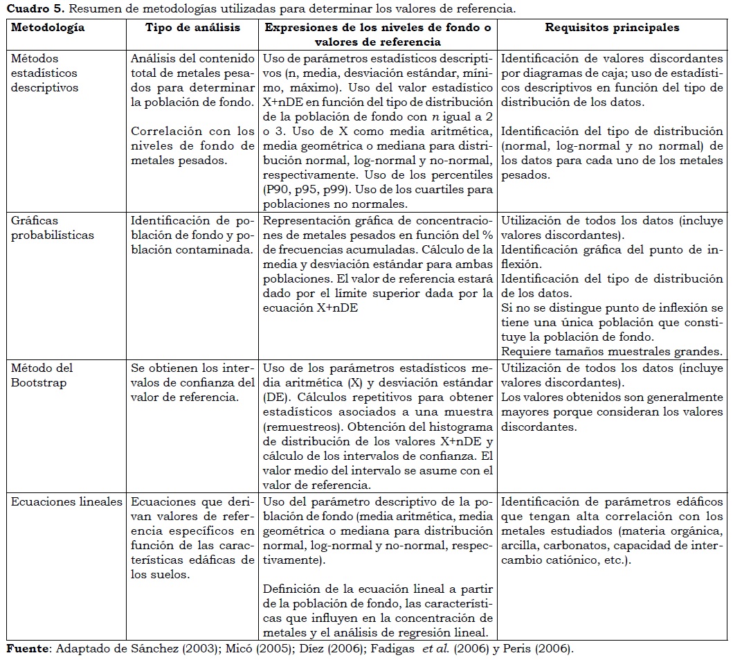 Los valores de referencia resultan a partir de la determinación de los niveles de fondo de metales pesados en suelos no contaminados, al incrementar los niveles de fondo en un valor estadístico que refleja la variabilidad de las concentraciones normales en el suelo. En diferentes regiones del mundo se han propuesto diferentes metodologías (Cuadro 5) para determinar los valores de referencia que han permitido desarrollar el marco normativo de prevención y protección de la contaminación de metales pesados en suelos (De Miguel et al., 2002; Peris, 2006; Gallardo y González, 2009).