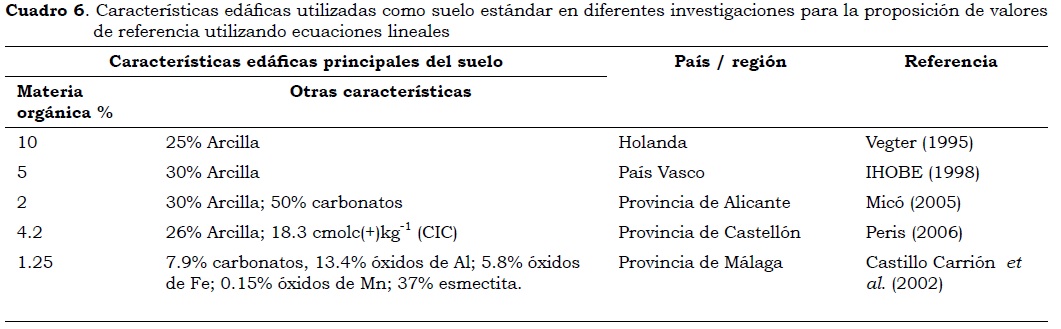 En el estudio del contenido de metales pesados en suelos se han utilizado las ecuaciones lineales para definir valores de referencia específicos de un área de estudio, relacionando en ellas las concentraciones de metales pesados y las características edafológicas asociadas con la retención-movilidad de los metales. Se considera que los valores de referencia derivados mediante esta metodología son similares a los hallados por otras metodologías (Vegter, 1995; Peris, 2006). Las ecuaciones lineales permiten derivar valores de referencia específicos para un caso concreto, al proponer el análisis de correlación entre las concentraciones de metales pesados y los contenidos típicos de algunas características y propiedades edafológicas como la materia orgánica, arcilla, carbonatos y otros parámetros que pueden afectar los niveles de metales pesados en el perfil del suelo. En el Cuadro 6 se resumen las características edafológicas utilizadas en diferentes trabajos para proponer los valores de referencia de metales pesados usando ecuaciones lineales para la correlación de variables.