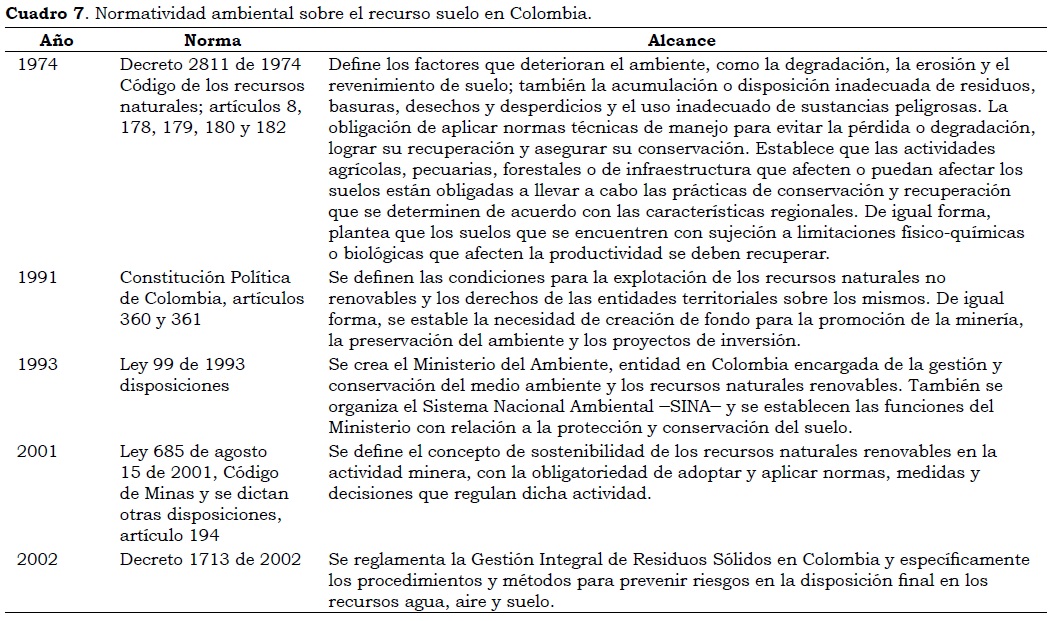 A partir de la década de los setenta, en Colombia se han expedido algunas directrices de orden general para la prevención y control de la contaminación de suelos en zonas de interés ambiental, con énfasis en la protección de los recursos naturales; sin embargo, aún no existen normas y políticas específicas que reglamenten la protección de los suelos como resultado de la contaminación antropogénica por metales pesados. En el Cuadro 7 se resumen las principales normas colombianas que incluyen acciones para prevenir y controlar la contaminación del recurso suelo.