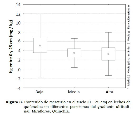 Para comparar las concentraciones de Hg en los estratos se consideró el valor de este elemento hasta 25 cm de profundidad, lo que permitió identificar diferencias (P < 0.001) entre estratos y altos valores del elemento (Figura 2). Esto permite comprobar que la actividad minera tiene un efecto sobre el incremento de la concentración de Hg en el suelo.