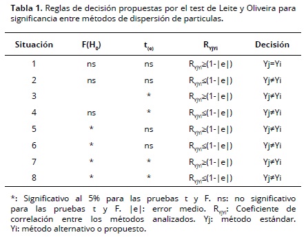 Para comparar los dispersantes químicos se utilizó el procedimiento propuesto por Leite y Oliveira (2002). La prueba, conocida como L.O., consiste en una regla de decisión construida con base en la estadística de ‘F’ propuesta por Graybill (1976) para la evaluación del error medio y en el análisis de los coeficientes de correlación lineal. Según estos investigadores Yj y Yi son vectores cuantitativos, en el que Yj indica un método, procedimiento o tratamiento alternativo y Yi es el tratamiento patrón; dos métodos son considerados estadísticamente iguales si simultáneamente después del ajuste de regresión lineal se cumple que: Yi = β0 + β1 Yi, β0 = 0 y β1 = 1, estando el valor Ryjyi muy próximo a 1. Teniendo en cuenta que esta situación es más ideal que real, los autores optaron por una modificación que aplica un análisis estadístico más completo.