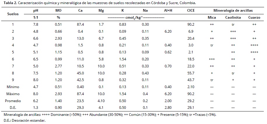 Los análisis de caracterización (Tabla 2) muestran que el pH de los suelos fue variable entre 4.7 y 8.0, la materia orgánica (M.O.) entre 0.5 y 2.9%; el calcio entre 0.4 y 87.4, el magnesio entre 0.1 y 10.0 y la acidez intercambiable entre 0.40 y 6.20 cmolc/kg.