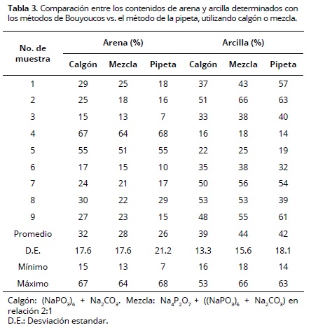 Un factor que puede haber contribuido para aumentar la capacidad dispersante de las fracciones texturales del suelo cuantificadas por el método de Bouyoucos y el dispersante propuesto + calgón fue la aplicación de agitación lenta a 60 r.p.m. durante un periodo de 6 h. Con esta variación en tiempo de agitación, las partículas presentes en la suspensión mantienen un mayor tiempo de fricción entre ellas, generando rompimiento de los agregados y por tanto separación de las partículas granulométricas que se encuentran floculadas. Kettler et al. (2001) señalan que la agitación mecánica se utiliza en combinación con los tratamientos químicos para mejorar la dispersión de las partículas del suelo. Silva dos Santos et al. (2010) encontraron que la agitación lenta proporciona menores valores de los coeficientes de variación, además mayor precisión de los datos, cuando es comparada con el método de agitación rápida.