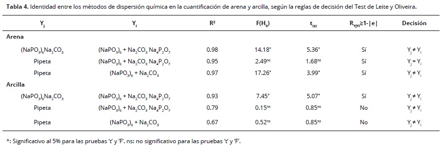 Cuando se aplicó el test de Leite y Oliveira para analizar los resultados de los porcentajes de arena y arcilla obtenidos por las tres metodologías para cada suelo, se encontró que existe identidad entre métodos cuando se comparan los resultados de los contenidos de arena obtenidos por el método de pipeta con el dispersante calgón y el método de Bouyoucos al utilizar la mezcla propuesta como dispersante (Tabla 4). Estos resultados se explican porque las pruebas de ‘F’ y ‘t’ no presentaron diferencias estadísticas, con coeficientes de correlación 0.95 y 0.98, respectivamente. Una situación similar ocurrió para el contenido de arcilla, con coeficientes de correlación de 0.67 y 0.93. Según Akiyoshi y Dalvan (2009) el mayor problema de dispersión está relacionado con la fracción de arcilla, porque la no dispersión de estas partículas puede resultar en agregados que subestiman su contenido de arcilla y sobrestiman el contenido de limo.