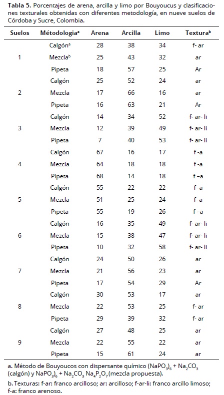 Finalmente, al analizar los porcentajes de arena, arcilla y limo cuantificados con los dos dispersantes químicos a 60 rpm usando el método Bouyoucos y los determinados por el método de pipeta y calgón, se observa que la clasificación textural es equivalente en la mayoría de los suelos (Tabla 5). Chaudhari et al. (2008) concluyeron que con el método Bouyoucos usando calgón como dispersante se obtienen contenidos superiores de arcilla frente a los obtenidos con el método de pipeta, de esta forma se desencadenan diferencias significativas que impiden la coincidencia en el análisis textural. Vitorino et al. (2007) consideran que el análisis granulométrico requiere energía suficiente para vencer las fuerzas de unión de los agregados y sustancias húmicas, las cuales deben ser fragmentadas a través del choque mecánico. De acuerdo con Tavares y Magalhães (2008) la dispersión total del suelo coincide con la destrucción de los agregados. Al comparar las clases texturales determinadas por la mezcla propuesta (NaPO3)6 + Na2CO3+ Na4P2O7 se observa que no se encontraron clasificaciones texturales diferentes a las obtenidas con pipeta, lo que no ocurre con el método de Bouyoucos con el dispersante calgón, en el cual se presentaron texturas diferentes en los suelos 1 y 8 estudiados.