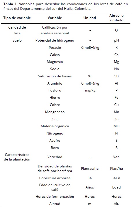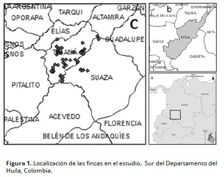 Para el estudio fueron seleccionadas 54 fincas pertenecientes a la Asociación de Productores Agrícolas en el sur del Departamento del Huila (Colombia) ubicadas entre los municipios de Suaza y Timaná con un área de influencia del estudio de 310 Km2 y diferentes rangos altitudinales, características de plantación y beneficio del fruto (Figura 1). Las variables evaluadas in situ y los datos recopilados en entrevistas con los agricultores se incluyen en el Tabla 1. El manejo del suelo se caracterizaba por lo implementación de las tecnologías recomendadas por la Federación Nacional de Cafeteros y consistentes en la aplicación de nitrógeno como urea, fosfato diamónico DAP y cloruro de potasio KCl, de acuerdo con el esquema propuesto por Sadeghian y Gonzáles (2012) para cultivos en producción. En cada una de las fincas se seleccionó un lote de café manejado bajo arreglo agroforestal en la cual se tomó una muestra de suelo compuesta hasta 15 cm de profundidad, así como también un muestra de café cereza siguiendo la metodología propuesta por Banegas (2009) y Lara (2005) para realizar el análisis de atributos de calidad de taza.