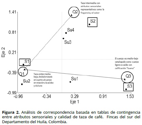 En 54 fincas cultivadas con café (Coffea arabica L.) en rangos altitudinales, características de plantación y formas de beneficio del fruto diferentes, en los municipios de Suaza y Timaná (Departamento del Huila), Colombia, se evaluaron la relación entre estas variables de cultivo y manejo con los atributos sensoriales en taza. Para el estudio fueron utilizados el método estadístico Análisis de Correspondencias Múltiples (ACM) y Partial Least Square (PLS) para determinar la relación entre los atributos sensoriales y las características del suelo y de manejo de la plantación. A través del análisis de varianza multivariado mediante la prueba de Hotelling se encontraron diferencias (P < 0.001) para pH, Ca, Mg, Na, saturación de bases (SB), Al, P, Zn, así mismo, se observaron diferencias (P < 0.01) para K, Mn, M.O y B entre los tipos de suelos. En general, el perfil de las tazas fueron de cuerpo medio, algunas ácidas e intermedias con atributos sensoriales representativos. La calidad de taza Q3 se relacionó con atributos sensoriales como cuerpo, dulzor, balance, sabor, acidez y estos con variables de características de la plantación como densidad de siembra (Ds), edad, altura y elementos químicos con azufre (S). Q2 fue una taza afectada por el tiempo de la fermentación (horas) y por variables químicas como pH, SB, Ca, Mg además variables de manejo como sombra, la cual depende de la altura del sitio en el cual se encuentra el cultivo. Q1, que presentó baja calificación en los atributos sensoriales, se relacionó con variables del suelo como Al y Fe.
