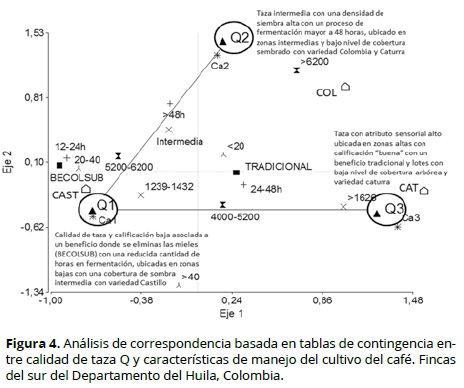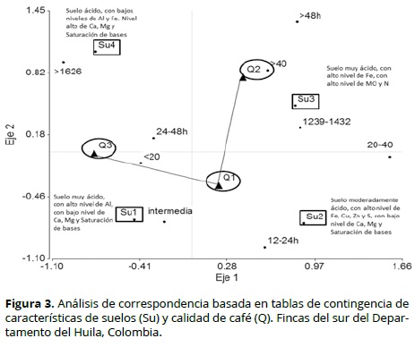 En la Figura 3 aparecen las relaciones entre los tipos de suelos y la calidad de café, donde se observa una relación entre la tipología suelo muy ácido, con alto nivel de Al, con bajo nivel de Ca, Mg y SB y la calidad de taza Q3. Los suelos moderadamente ácidos, con alto nivel de Fe, Cu, Zn y S y bajo nivel de Ca, Mg y SB se relacionaron con calidad Q1. Los suelos muy ácidos, con altos niveles de Fe, MO y N se relacionaron con calidad de taza Q2. Las fincas en el estudio se encuentran a bajas alturas con niveles de cobertura arbórea (%CA) menor que 20%, densidades de siembra entre 4000 y 5200 árboles/ha y tiempos de fermentación de grano entre 24 y 48 horas. Estas condiciones de manejo y cultivo afectan los atributos sensoriales como lo demuestra la relación existente entre Q3 y los lotes que se encuentran a más de 1626 m.s.n.m., con una cobertura de sombra menor que 20% (Figura 3).