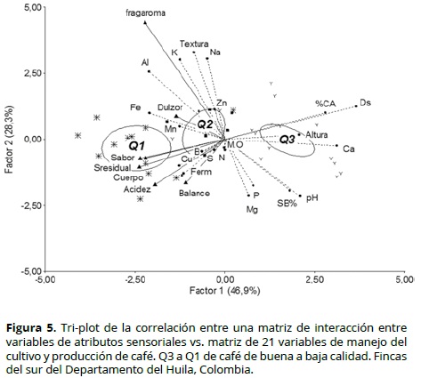 El 75.2% de la variabilidad fue explicada al correlacionar las variables de atributos sensoriales con la matriz de 21 variables relacionadas con la química del suelo, características de la plantación y producción de café, encontrando una relación directa entre la calidad de café Q3 y los atributos sensoriales acidez, cuerpo, sabor residual, sabor y balance. La calidad de taza Q1 se relacionó principalmente con variables de características de la plantación como densidad de siembra (Ds) y cobertura arbórea (%CA) que dependen directamente del rango de altura en la que se encuentra el cultivo, lo cual afecta negativamente los atributos sensoriales del grano (Figura 5).