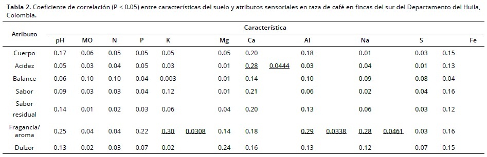 the Municipalities of Suaza and Timana (Department of Huila, Colombia) 55 lots located were selected with different altitude ranges, and crop management conditions benefit to evaluate the relationship among soil chemical characteristics and sensory attributes driving the cup. The statistical method used was Multiple Correspondence Analysis (MCA) and Partial Least Square (PLS) analysis to determine the relationship among the sensory attributes and variable agronomic management and soil parameters. Through multivariate analysis of variance test using Hotelling significant differences (P < 0,001) for pH, Ca, Mg, Na, base saturation (SB), Al, P, Zn were found, also, significant differences (P<0,001) for K, Mn, MO and B were observed among the soil types. The cups were half-length, with some acidic and intermediate representative sensory attributes. Q3 related to sensory attributes as a body, sweetness, balance, flavor, acidity, and these variables with crop management such as plant density (Ds), age, height and chemicals with Sulfur (S). Q2 was affected by management in cup the fermentation process and chemical characteristics such as pH, SB, Ca, Mg as well shadow management variables which depends on the height at which it is growing. Q1 that had low scores on the sensory attributes related to soil characteristics such as Al and Fe.
