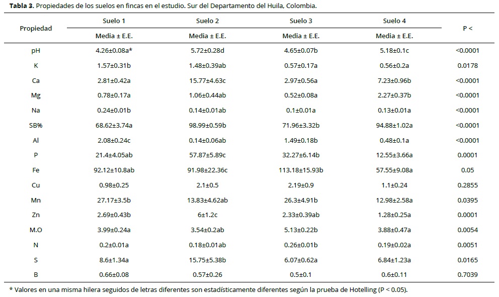 En el análisis de varianza multivariado se detectaron diferencias (P < 0.001) para pH, Ca, Mg, Na, SB, Al, P, Zn y para K, Mn, M.O y B entre los tipos de suelos (P < 0.001) (Tabla 2). La calidad de taza (Q) mostró diferencias en tres niveles en atributos como acidez, balance, cuerpo y calificación, donde Q1 y Q3 fueron el grupo de menor y mayor calificación, respectivamente (Figura 2).