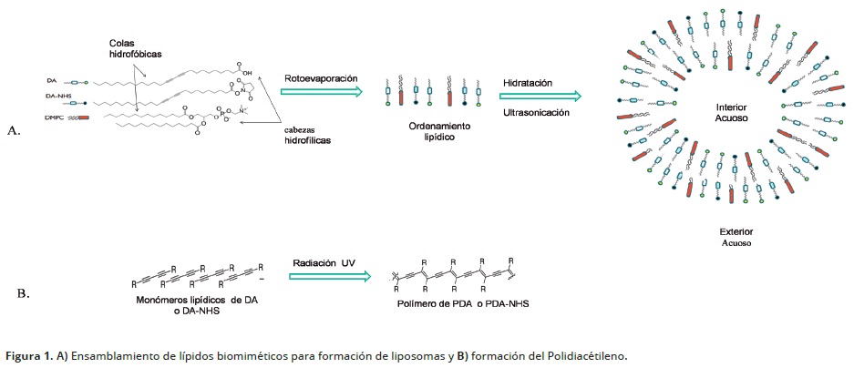 Los liposomas se prepararon a partir de una mezcla de DA (80%) y DMPC (20%) obteniendo una concentración final de 1 mM, siguiendo el método de depósito de capa delgada combinado con tratamiento de ultrasonido e hidratación con PBS a 10 mM y pH 7.4 presentada por Jiang et al. (2015). Lo anterior se realizó disolviendo los cristales de DA y DMPC en diclorometano y luego se filtró y se llevó a roto evaporación bajo condiciones de vacío durante 30 minutos hasta la deposición de una capa delgada y uniforme; seguido se llevó la capa de hidratación en baño ultrasónico bajo un poder de sonicación de 110 W hasta disolución de la capa en el buffer de fosfato salino a 10mM y pH 7.4. La dispersión lechosa obtenida se llevó a homogenización por ultrasonido bajo las condiciones de 75°C, 25 % de amplitud de onda, ciclo de pulso de 1:5 s y una emisión energética de 3000 J; posteriormente se filtró usando una membrana de policarbonato de tamaño de poro 1 µm. La formación de nanoliposomas se promovió bajo refrigeración durante 8 horas. Previamente para cada ensayo, los liposomas se fotopolimerizaron en un contenedor de vidrio refrigerado mediante irradiación UV (λ=245 nm) emitida por una lámpara de mercurio de sonda Entela modelo PS1, durante 5 minutos. Los liposomas sin polimerización se funcionalizaron con Nhidroxisuccinimida (DANHS), reemplazando un 20% del monómero de DA por el monómero DANHS.