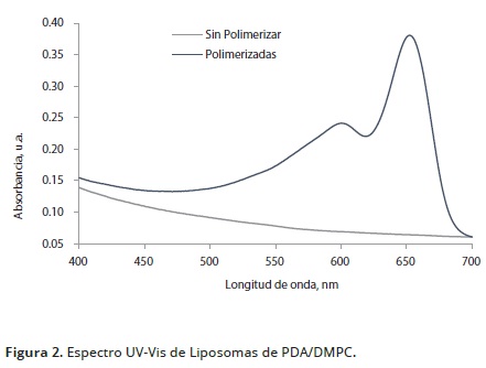 La solución de liposomas polimerizados a 1 mM, constituidos por una mezcla de DA y DMPC se caracterizó por espectroscopia de absorción como se muestra en la Figura 2. En el espectro de absorción molecular del PDA (trazo azul) se identifica la banda de absorción característica de la forma azul a 651 nm, que corresponde a la transición *, resultante de la conjugación polimérica de la cadena ene ino que contiene los electrones según lo afirma Yuan y Hanks (2008). Además de esta banda de excitación, se presenta un hombro a 593nm que corresponde a la absorción de vibración del PDA descrita por Kim et al. (2012). Cuando el espectro visible se compara con el espectro de los liposomas sin polimerización, estas bandas de absorción están ausentes (trazo verde). Los centros reactivos del triple enlace solamente rotan, mientras que el empaquetamiento espacial de la cadena polimérica se forma de una cadena alternada de dobles y triples enlaces ordenados, reportadas también por Reppy y Pinzola (2007). Las estructuras resultantes, tanto en el caso de los liposomas como de otros sistemas macromoleculares organizados de PDA acumulan estrés a lo largo de la cadena polimérica inferido por Filhol et al. (2009). Este estrés contribuye a cambios en la deslocalización de los orbitales , que hace a los liposomas sensibles a varias perturbaciones externas, que incluyen, temperatura, polaridad del solvente, pH, presión, interacciones químicas y biológicas.