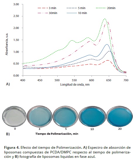 La Figura 4A presenta los espectros UVVis de los liposomas en función del tiempo de polimerización. El comportamiento observado consistió en un incremento gradual de la intensidad de absorción a 651 nm con respecto al periodo de fotopolimerización. La mayor intensidad de absorción se obtuvo cuando los liposomas se expusieron a la luz UV por 20 minutos; sin embargo, la longitud de onda de la máxima absorción experimentó un cambio hipsocrómico de 651 a 644 durante irradiación prolongada, de 10 a 20 minutos. Este comportamiento indica la inducción de un fenómeno irreversible en la transición colorimétrica correspondiente al cambio de configuración de la longitud del enlace de la cadena conjugada del polidiacétileno. Lo anterior, limita la capacidad de transducción colorimétrica de los liposomas en las interacciones biológicas o químicas que incluyen comportamientos como baja sensibilidad o respuestas analíticas erróneas. Por lo tanto, se escogió 5 minutos como el tiempo de polimerización de los liposomas.
