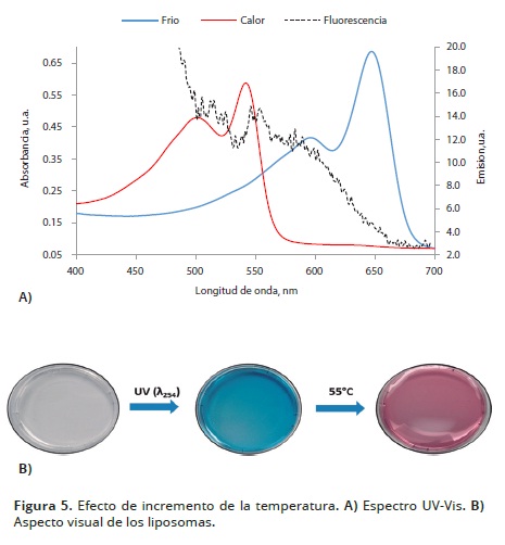 Efecto de temperatura. Los liposomas se polimerizaron 5 minutos y se introdujeron en un baño de agua termostatado a 55 °C, durante 10 minutos. El espectro de absorción se obtuvo antes y después del procedimiento. También se determinó la emisión fluorescente aplicando una longitud de onda de excitación de 440 nm en el rango de 500 a 700 nm (De Oliveira et al, 2013).