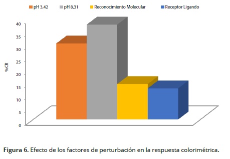 El cambio óptico de los liposomas en respuesta a la adición de ácido, base, enlace covalente de una proteína (interacción receptorligando) y actividad enzimática fueron evaluados mediante la respuesta colorimétrica porcentual (RC%). En la Figura 6 se aprecia que la mayor respuesta colorimétrica se obtuvo en presencia de NaOH a pH 8.31, con un RC de 37,3%. Se interpreta como la interacción entre el hidrogenión del grupo carboxilo del PDA y el hidroxilo proveniente del hidróxido de sodio, mientras que la adición de ácido clorhídrico tuvo un efecto menor en la respuesta colorimétrica (29,9%), similar a los resultados obtenidos por Charoenthai et al. (2011).