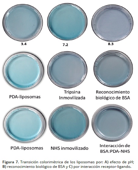 La inmovilización covalente del elemento de reconocimiento químico o biológico en la superficie del liposoma, facilita la interacción con una molécula reactiva o con el sustrato biológico y promueve una transformación colorimétrica. La reacción química entre la Nhidroxisuccinimida y el grupo amino del aminoácido lisina, proveniente de la albúmina sérica bovina (BSA) origina la transición colorimétrica, con un CR de 13,9%. Por otra parte, el reconocimiento biológico entre el receptor tripsina y el ligando BSA, ocasionó la transición colorimétrica con un CR de 12,0%.