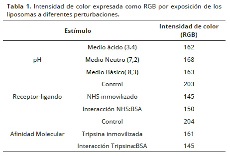 Los liposomas expuestos a efecto de pH, interacción química y biológica fueron registrados fotográficamente, estas imágenes se analizaron por el valor RGB obtenido del software image J®.