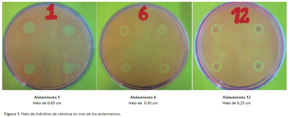 Los resultados de la prueba del Rojo Congo se reportan en la Tabla 3, ordenados de mayor a menor según la amplitud del halo de hidrólisis de celulosa producido. El número de células de cada aislamiento utilizado en la prueba indica que su crecimiento utilizando celulosa fue similar al generalmente obtenido para bacterias con otras fuentes de Carbono. Al tercer día de crecimiento, el diámetro de la colonia fluctuó entre 1.75 (Aislamiento No. 7) y 0.7 cm (Aislamiento 17) y la amplitud del halo entre 0.65 (Aislamiento No.1) y 0.1 cm (Aislamiento 51). Independientemente del diámetro de la colonia, en cinco aislamientos no se produjo halo de hidrólisis de celulosa y en los otros 15 la amplitud del halo varió entre 0.65 y 0.1 cm. Entre los aislamientos sobresalieron el número uno con halo de 0.65 cm, el dos con halo de 0.54 cm, el siete con halo de 0.33 cm, así como el seis y 14 con halo de 0.3 cm. En la Figura 1, se ilustra la amplitud del halo producido en tres de los aislamientos.