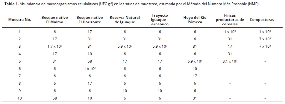 La abundancia de microorganismos celulolíticos, mostró una mayor tendencia en las composteras que en los suelos (Tabla 1). Mientras en las composteras el número de UFC g-1 oscilaba entre 103 y 7 × 103, en los suelos de bosque fluctuaba entre 6 y 6.9 × 103 y finalmente, en los suelos cultivados con cereales, entre 17 y 103.