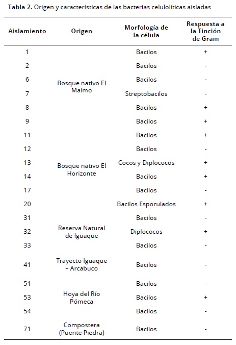 De 97 aislamientos obtenidos inicialmente en medio AN, 20 crecieron en medio sólido mineral, utilizando celulosa como única fuente de carbono y energía. De dichos aislamientos, seis procedieron del bosque El Malmo, seis del bosque El Horizonte, tres de la Reserva Natural de Iguaque, uno del trayecto Iguaque Arcabuco, tres de la hoya del Rio Pómeca y uno de la compostera del vivero Coraflor (Tabla 2). La gran mayoría de las bacterias celulolíticas aisladas presentaron forma bacilar y en cuanto a la Tinción de Gram, aproximadamente la mitad mostró ser Gram+ y la mitad Gram- (Tabla 2). La existencia de bacterias celulolíticas Gram+ y Gram- se encuentra indicado en la literatura (Hatami et al. 2008).