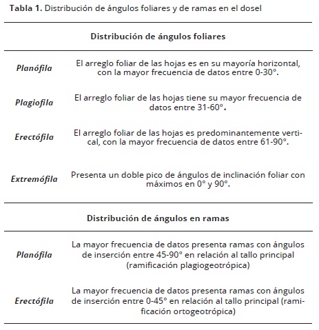 Para medir los ángulos foliares se utilizó un compástransportador similar al descrito por Norman & Campbell (1989), este dispositivo marca el grado de inclinación de la hoja al medir el ángulo formado entre una línea perpendicular y la superficie en el centro de la hoja. El ángulo de inserción de las ramas se midió con el mismo principio e instrumento. Estas mediciones se realizaron en la cuarta parte de las ramas presentes en un árbol, y a 10 de las hojas presentes en cada una de las ramas. Por cada genotipo, se realizó un análisis de frecuencia sobre el número de hojas en cada ángulo, determinando así su correspondiente distribución de ángulo foliar. De forma similar, los ángulos de inserción de ramas también serían clasificados (Tabla 1); el ángulo de ramas se obtuvo por el promedio de las mediciones. Adicionalmente se relacionó la frecuencia acumulada en cada ángulo foliar con las distribuciones teóricas propuestas por Goudriaan (1988) (Tabla 2).