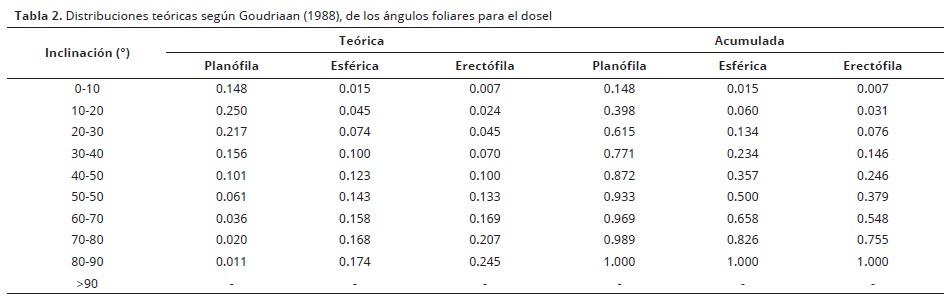 ) por genotipo se derivó con base en x, mediante las ecuaciones 2 y 3 propuestas por Wang & Jarvis (1988). Para la distribución esférica (x=1.0) el ángulo medio de la hoja es 57.4°.