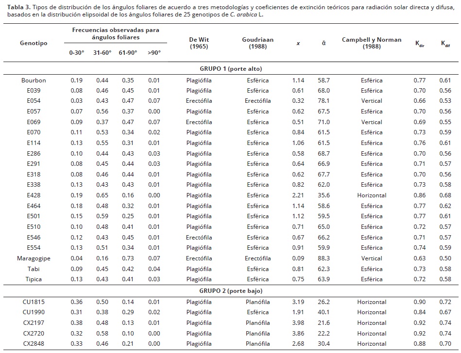 El parámetro x representa a la distribución elipsoidal de los ángulos foliares, la cual es la tasa entre los ejes verticales y los ejes horizontales asumiendo una distribución elipsoidal (Sinoquet & Andrieu, 1993). En particular la distribución esférica es una distribución elipsoidal con un x=1 (Campbell & Norman, 1988). En el presente trabajo los genotipos Bourbon, E039, E057, E070, E114, E286, E291, E318, E338, E464, E501, E510, E546, E554, Tabi y Típica con un parámetro x entre 0.58 y 1.14 se clasificaron como esféricos; E054 (x=0.32), E069 (x=0.51) y Maragogipe (x=0.09) como verticales, finalmente E428, CU1815, CU1990, CX2197, CX2720 y CX2848 como horizontales con valores de x mayores a 1.90 (Tabla 3). Solo para los genotipos E069, E428 y CU1990 la clasificación realizada con el criterio de Goudriaan (1988), no fue concordante con la realizada mediante el parámetro x, en relación a la tendencia de los ángulos (Tabla 3).