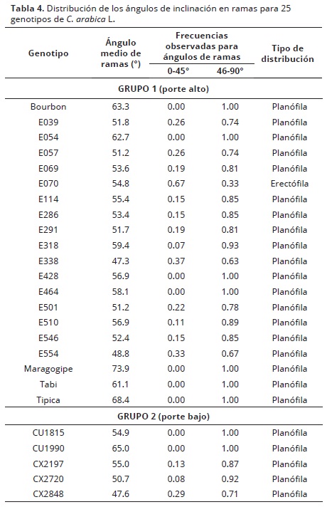 En la Tabla 3, se aprecia la clasificación de los 25 genotipos de C. arabica según tres conceptos de distribución foliar. La mayoría de los genotipos presentan una distribución plagiófila, con la excepción de E054, E069, E546 y Maragogipe de distribución erectófila (Tabla 3). Mejía et al. (2013), encontraron que 11 (BA36, Blue Mountain, Caturra, CU1812, Dilla Alghe, E87, Harrar R2, KF03, Mundo Novo, SL28 y Típica Rojo) de los 19 genotipos evaluados en su estudio fueron clasificados como plantas plagiófilas, al presentar un alto número de hojas con ángulos entre los 31 y 60°. Alvarado & Ochoa (2006), clasificaron 24 progenies de la variedad Castillo® con tres y cuatro años de edad como plantas planófilas, al tener ángulos foliares con valores medios entre 33° y 34°, dentro de estas progenies se encontraban CU1815 y CX2720, genotipos de este estudio, a diferencia del autor citado fueron plagiófilos (Tabla 3). En este sentido, es posible que respuesta se haya obtenido por la menor edad de los árboles de los 25 genotipos evaluados (2.6 años). Según Niinemets (2010) la edad de la planta y su tamaño afectan las características estructurales de la hoja, el tallo y los niveles del dosel.