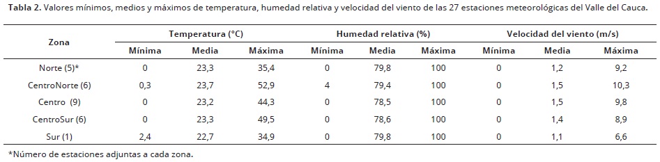 Para las 5 zonas planteadas por Cenicaña, con valores históricos de los últimos 10 años para cada estación, los datos mínimos, medios y máximos de temperatura, humedad relativa y velocidad del viento, se presentan en la Tabla 2.