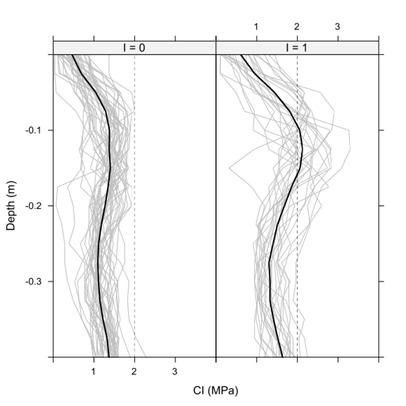 The group with I = 1 shows a marked increase of the mean CI at about 10-15 cm which exceed the 2 MPa threshold indicating compaction issues. In order to alleviate this compaction, it would be necessary to perform a vertical tillage, i.e. chisel plow, with a tillage depth of 20 cm. On the contrary, the mean CI of the remaining group is below the threshold and no tillage would be required. According to the spatial distribution of the indicator variable, the locations having compaction issues tended to be clustered in the middle of the plot suggesting the need for site-specific tillage (Figure 4).
