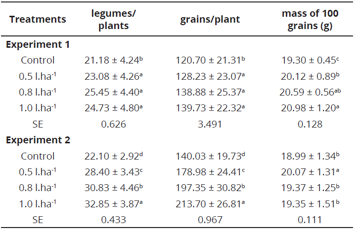 Table 2, shows the effect of the treatments on legumes per plant, grains per plant and the mass of 100 grains in both experiments.