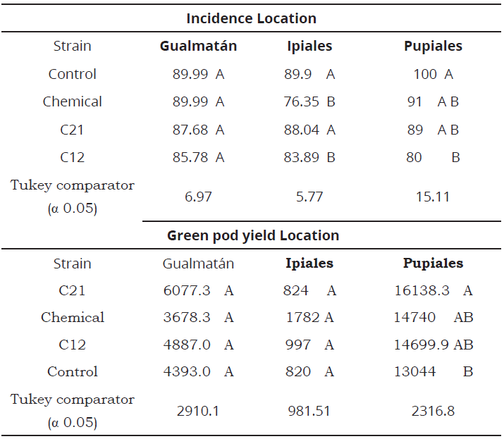 Table 6 Location * strain interaction for incidence and yield variables in the evaluation of four Trichoderma spp. strains in three locations of Nariño, department, Colombia
