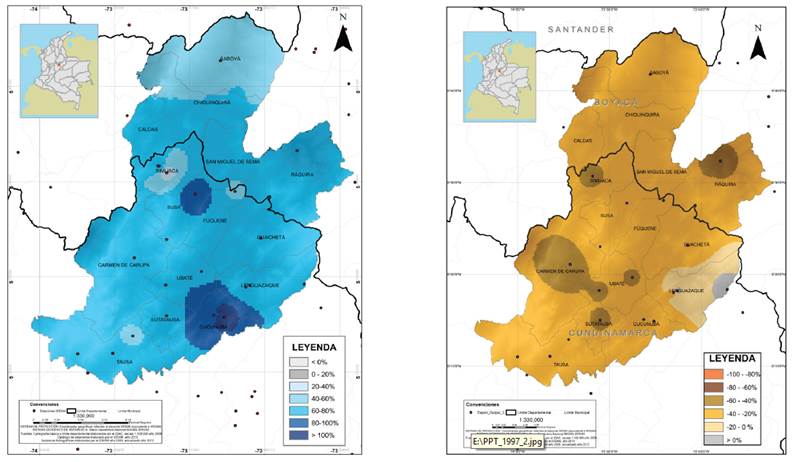 Figura 6 Anomalías porcentuales de precipitación en 2011 (izq.) y 1997 (der.) en el Valle de Ubaté y Chiquinquirá. Colombia.
