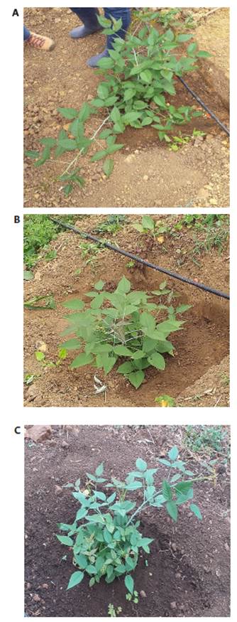 Figura 1 Cultivares de la investigación: A. Cultivar Brazos, B. Cultivar San Castilla sin espinas, C. Cultivar San Antonio.