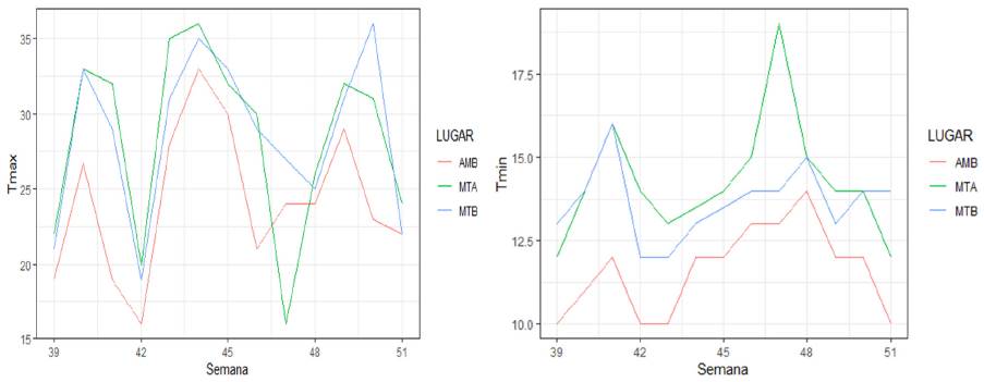 Figura 2 Comportamiento de Las temperaturas máximas y mínimas en Los tres ambientes: macrotúneL A (MTA), macrotúneL B (MTB) y ambiente (AMB).