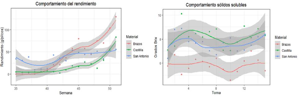 Según Alonso et al. (2008), el comportamiento de las variables meteorológicas influye en el desarrollo óptimo de los cultivos. El efecto de la temperatura resulta significativo, pues está relacionado con el crecimiento, debido a su efecto acelerador en la velocidad de las reacciones bioquímicas y los procesos internos ligados al transporte de savia. En algunos casos, las temperaturas superiores a 38 °C resultan desfavorables, pues la fructificación se retrasa y pueden ocasionar deformaciones en frutos y aparición de las flores estériles como lo que sucede con el cultivar de Brazos entre la semana 30 y 40, donde se presentan las mayores temperaturas al interior del macrotúnel B.