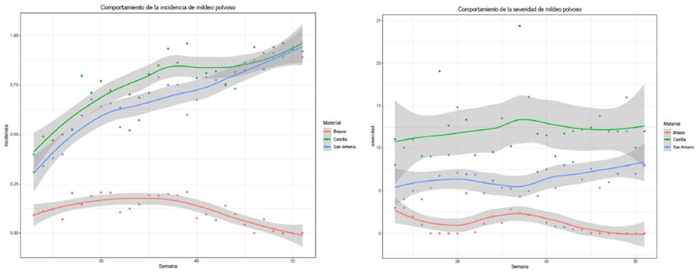 En la Figura 4 se puede observar el comportamiento de la incidencia de mildeo polvoso (Oidium sp.) hasta la semana 51, la cual es permanente para los tres cultivares con una menor incidencia para el cultivar Brazos y una mayor para el cultivar Castilla sin espinas, seguido del cultivar San Antonio. También, se evidencia que a partir de la semana 30 se presenta un incremento significativo en la incidencia del patógeno, los cuales coinciden con periodos donde se registran las temperaturas más altas. Esta enfermedad, según el estudio realizado por Patiño et al. (2015) incrementa su incidencia cuando se presentan condiciones de temperaturas altas y constantes, es decir temperaturas entre 20 a 30 °C, de manera similar a lo observado en el presente estudio (Figura 2). Además, durante periodos de baja precipitación se favorece su incidencia (Tamayo, 2003; Franco y Bernal, 2020). Otros casos sugieren que las condiciones de humedad relativa alta en combinación con altas temperaturas son más favorables para este microorganismo (Agrios, 2014).