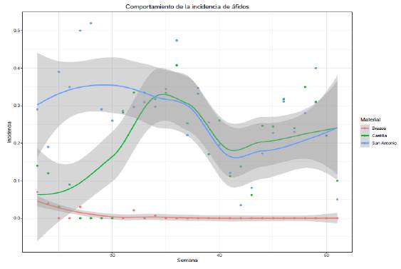 En la Figura 5 se observa el comportamiento en la incidencia de áfidos en cada uno de los cultivares hasta la semana 51, donde las mayores poblaciones se presentan entre las semanas 30 y 40, encontrándose los mayores picos poblacionales en la semana 30 para los cultivares San Antonio y Castilla. Es evidente ver cómo la temperatura ejerce una gran influencia sobre el aumento poblacional de los áfidos, ya que precisamente en ese rango de semanas se presentan los registros de temperatura más altos. Coscollá (1980) asegura que el nivel térmico no solo influye sobre la velocidad de desarrollo del insecto, sino también sobre las actividades biológicas, como, por ejemplo, la influencia que tiene la temperatura sobre su fecundidad.