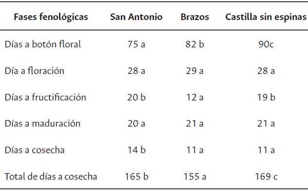 Dentro de las características más representativas encontradas en este estudio, se tiene que los cultivares San Antonio y Castilla sin espinas presentan flores con cinco pétalos lanceolados de color blanco, sin embargo, se alcanzan a observar algunas flores del cultivar Castilla sin espinas con seis pétalos; mientras que el cultivar Brazos presenta una flor con pétalos redondeados con cinco pétalos y un color de pétalo blanco con trazas violeta. Por otro lado, se observa que, para el número de flores fecundadas, los tres cultivares estudiados presentaron diferencias estadísticamente significativas.